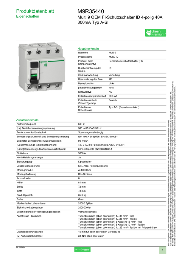 Schneider Electric M9R35440 Wyłącznik różnicowoprądowy A 40 A 0.3 A