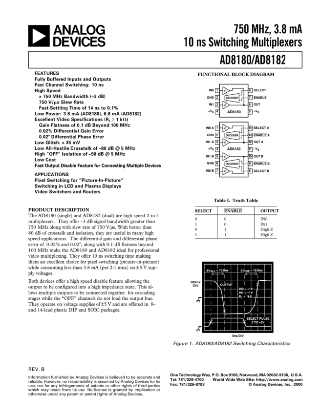 AD8180: Single, 2:1 Buffered, 750 MHz, 3.8 mA 10 ns Switching Multiplexer