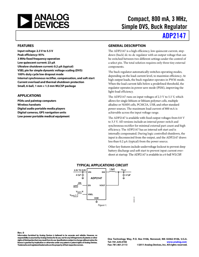 ADP2147: Compact, 800 mA, 3 MHz, Simple DVS, Buck Regulator
