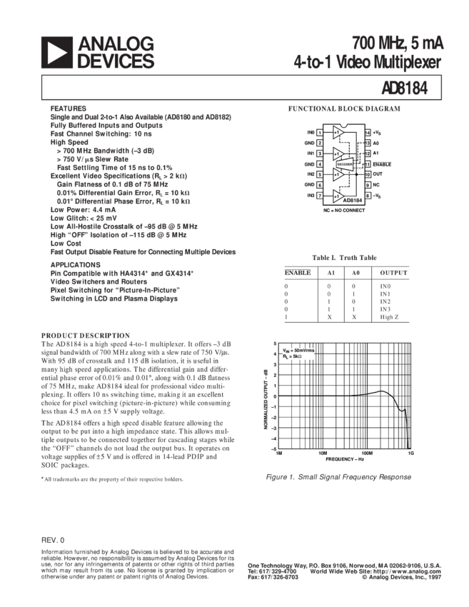 AD8184: 700 MHz, 5 mA, 4-to-1, Buffered Video Multiplexer