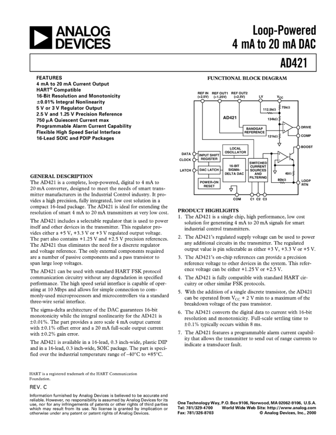 AD5420: Single-Channel, 12-/16-Bit, Serial Input, 4 mA to 20 mA, Current Source DAC