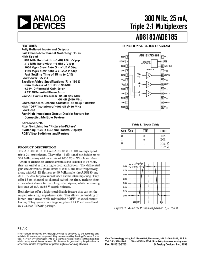 AD8185: 310 MHz, 25 mA, Triple 2:1, Buffered (Gain = +2) Multiplexer