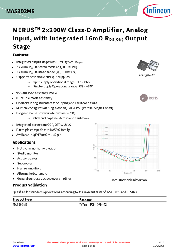 MERUS™ 2-channel analog input class D audio multichip module optimized for low-impedance speakers The MA5302MS is optimized for 1-2 Ω speaker impedances. It offers the same or higher output power than monolithic alternatives without heatsink and 50% less footprint. This MCM solution integrates 2 channel PWM controller, high voltage gate driver, and 4 low RDS(ON) MOSFETs. It includes standard Class D protection features for reliable operation over various environmental conditions. MA5302MS has the same 7x7