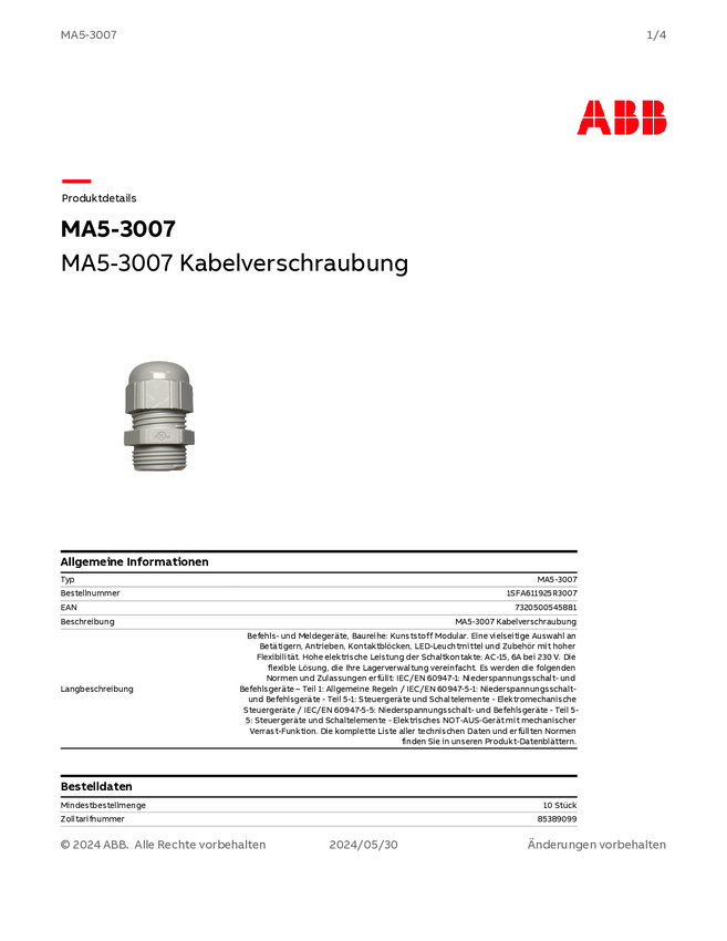 ABB 1SFA611925R3007 Dławnica kablowa MA5-3007, 1 szt.