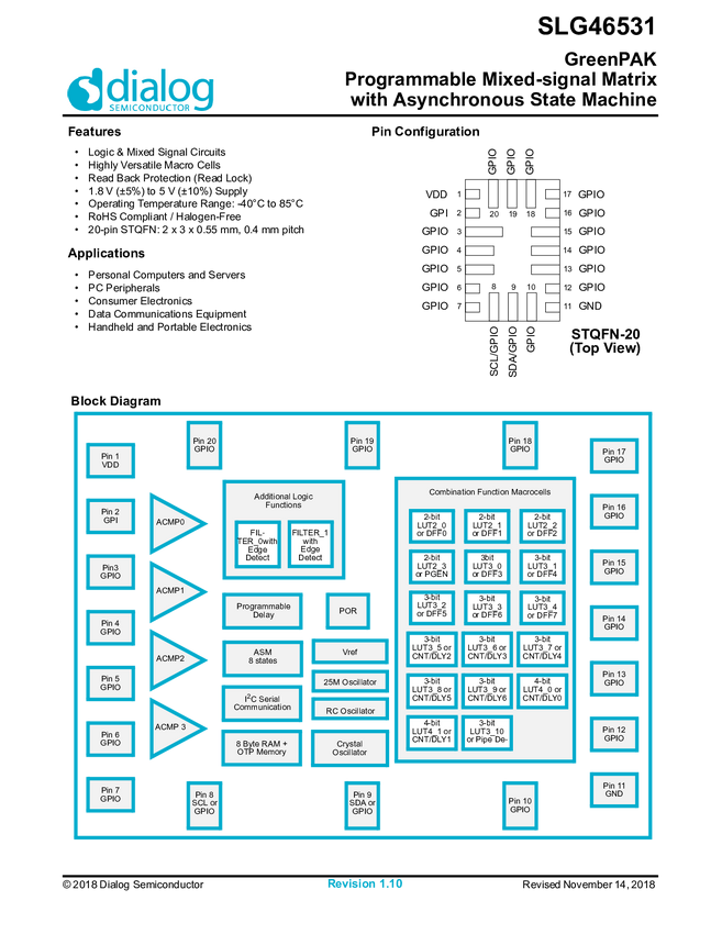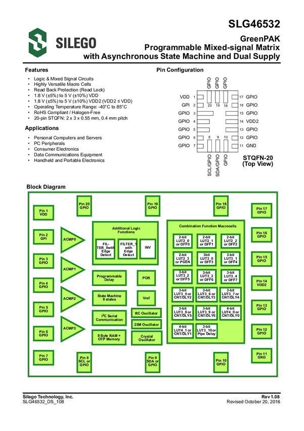 GreenPAK Programmable Mixed-signal Matrix with Asynchronous State Machine and Dual Supply