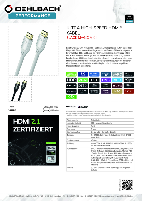 Kabel HDMI Oehlbach Black Magic MKII D1C92496, HDMI-A do HDMI-A, 5.00 m