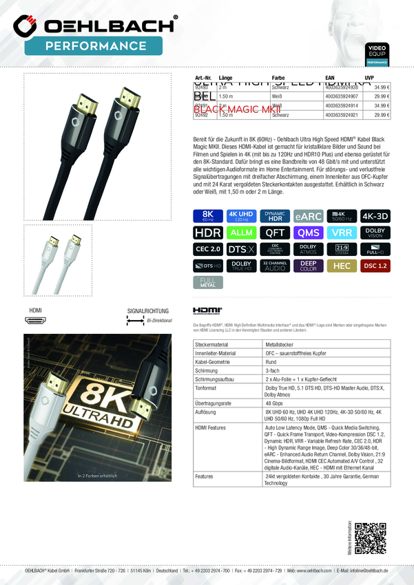 Kabel HDMI Oehlbach Black Magic MKII UHS D1C92490, HDMI-A do HDMI-A, 1.50 m
