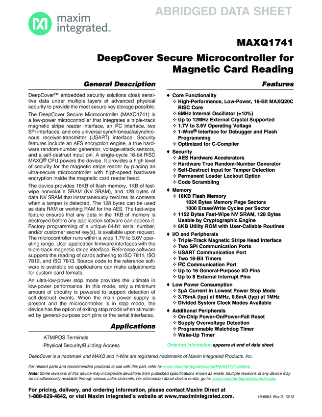MAXQ1741 DeepCover Secure Microcontroller for Magnetic Card Reading