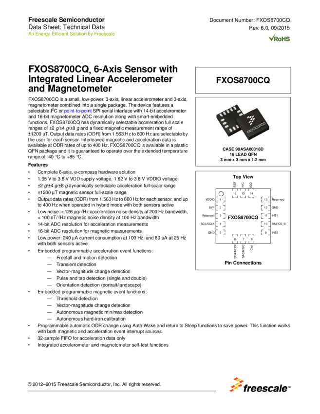 FXOS8700CQ: Digital Sensor - 3D Accelerometer (±2g/±4g/±8g) + 3D Magnetometer