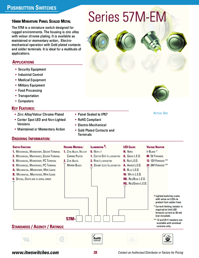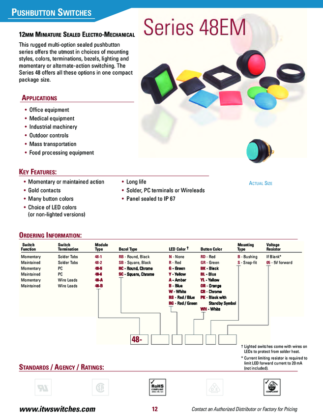 Switch Push Button N.O. SPST Round Button 0.25A 48VDC Maintained Contact Solder Panel Mount