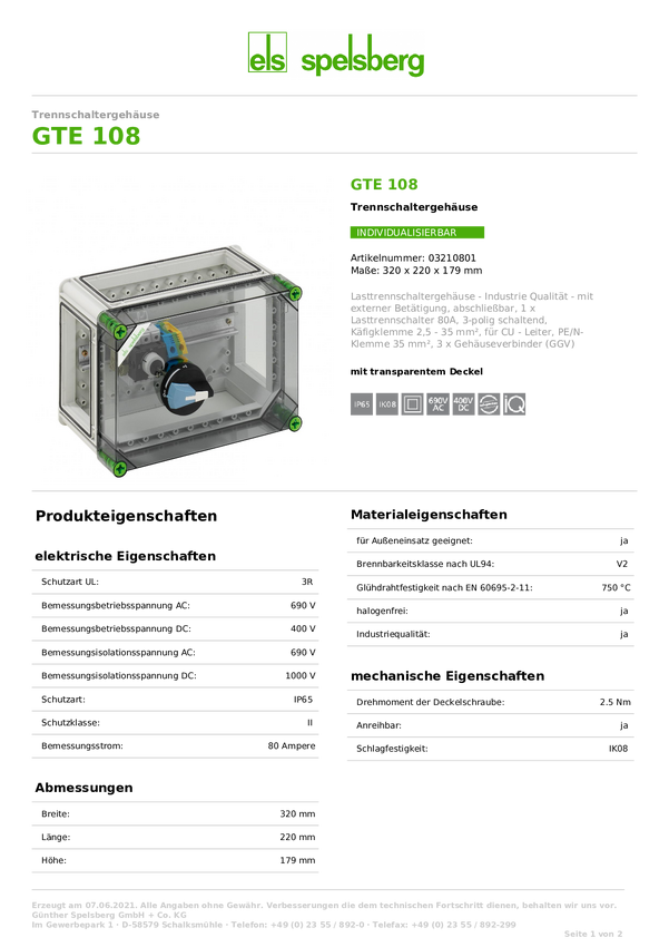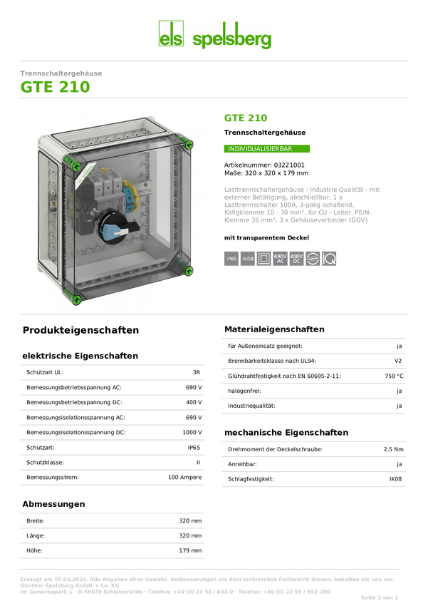 Przełącznik rozłączający Spelsberg GTE 210 Maksymalne napięcie przełączania: 690 V/AC (S x W x G) 320 x 320 x 179 mm