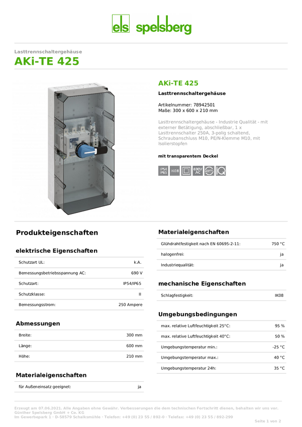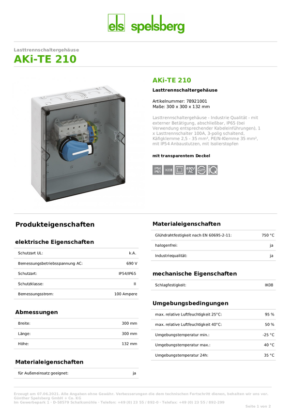 Przełącznik rozłączający Spelsberg AKi-TE 210 Maksymalne napięcie przełączania: 690 V/AC (S x W x G) 300 x 300 x 132 mm
