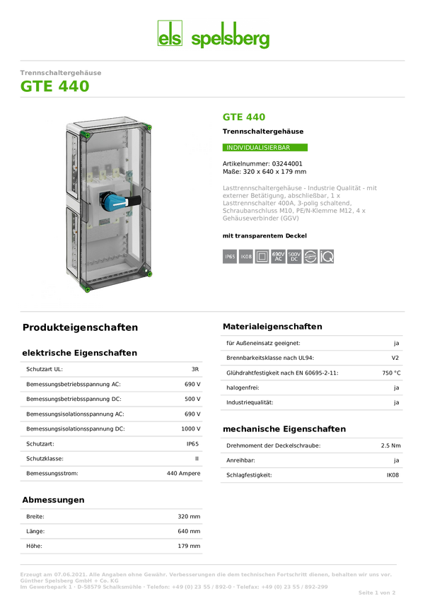 Przełącznik rozłączający Spelsberg GTE 440 Maksymalne napięcie przełączania: 690 V/AC (S x W x G) 320 x 640 x 179 mm