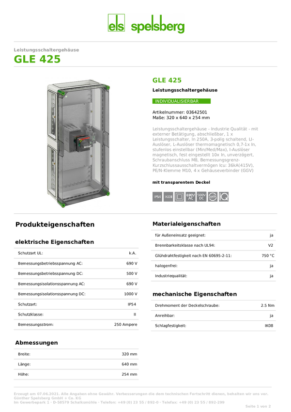 Wyłącznik zasilania Spelsberg GLE 425 Maksymalne napięcie przełączania: 690 V/AC (S x W x G) 320 x 640 x 254 mm 1 szt