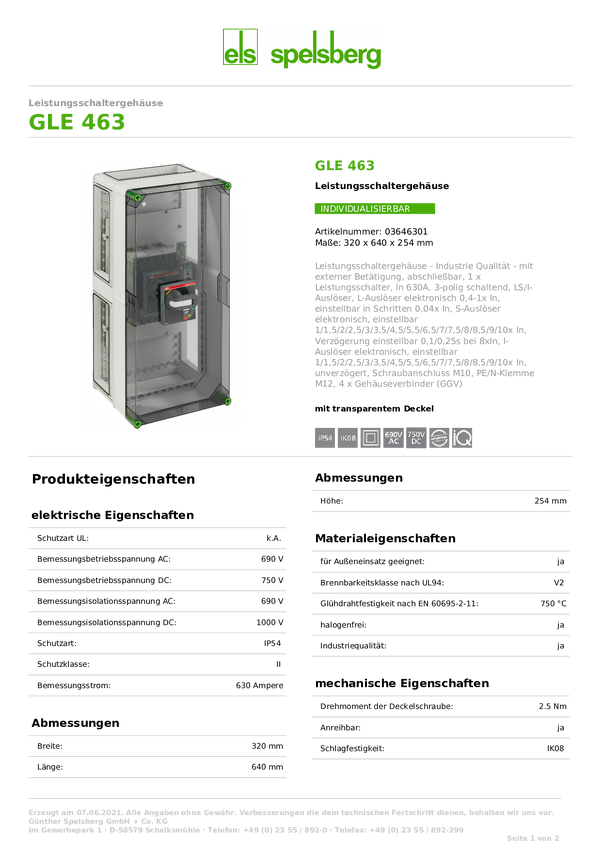 Wyłącznik zasilania Spelsberg GLE 463 Maksymalne napięcie przełączania: 690 V/AC (S x W x G) 320 x 640 x 254 mm 1 szt
