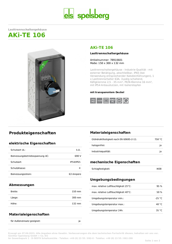 Przełącznik rozłączający Spelsberg AKi-TE 106 Maksymalne napięcie przełączania: 690 V/AC (S x W x G) 150 x 300 x 132 m