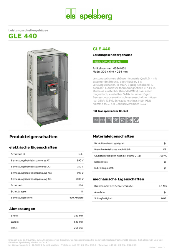 Wyłącznik zasilania Spelsberg GLE 440 Maksymalne napięcie przełączania: 690 V/AC (S x W x G) 320 x 640 x 254 mm 1 szt