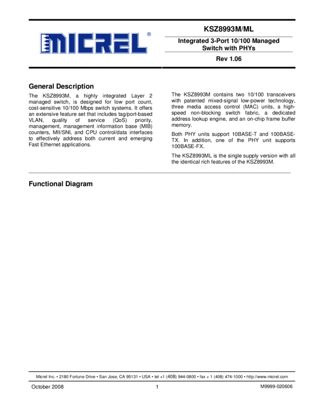 KSZ8993M/ML - Integrated 3-Port 10/100 Managed Switch with PHYs