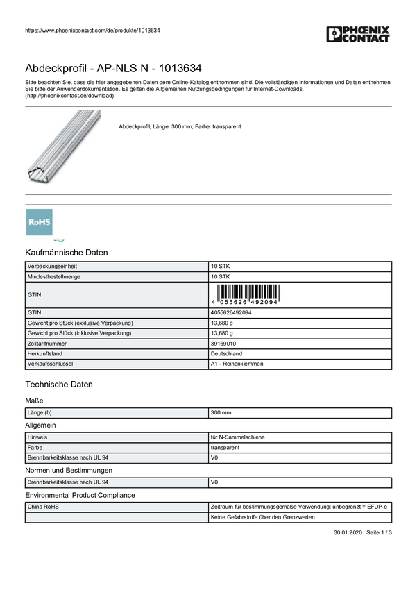 Profil maskujący Phoenix Contact AP-NLS N 1013634, 10 szt.
