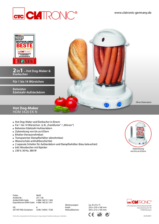 Clatronic HDM 3420 EK N 251136 Maszynka do Hot Dogów biały