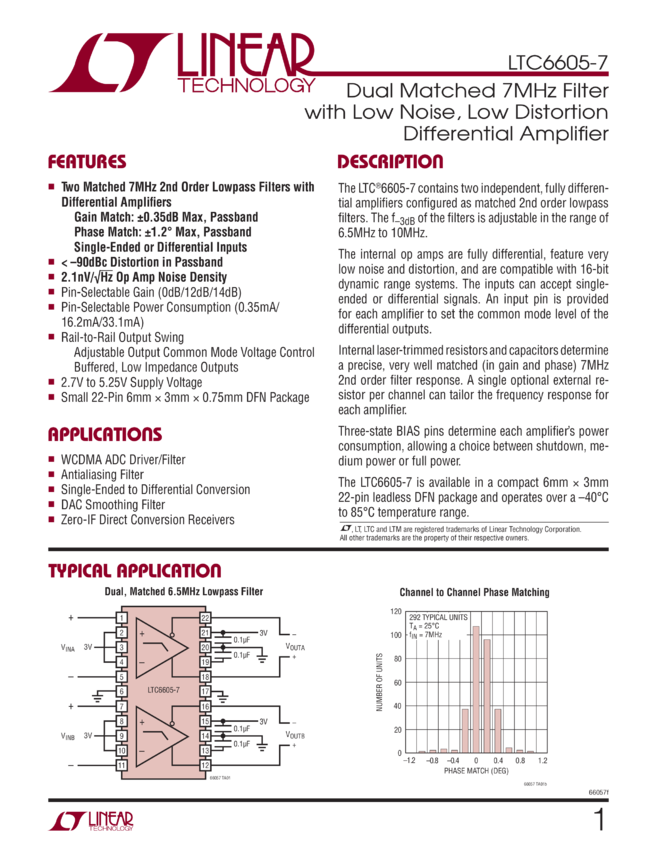 Dual Matched 7MHz Filter with Low Noise, Low Distortion Differential Amplifier
