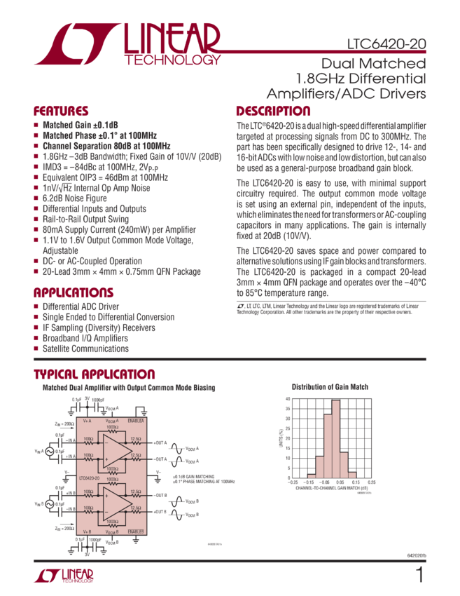Dual Matched 1.8GHz Differential Amplifiers/ADC Drivers