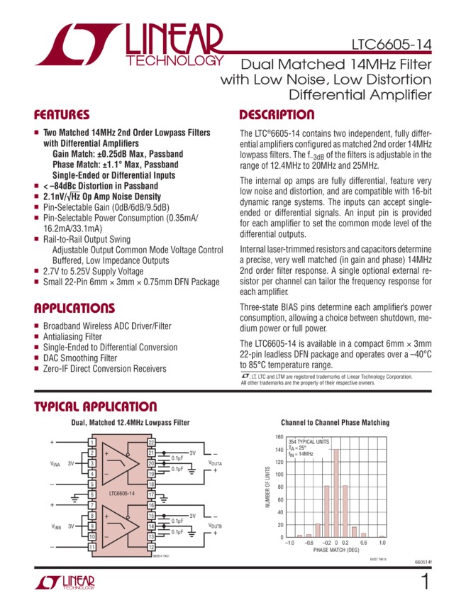 Dual Matched 14MHz Filter with Low Noise, Low Distortion Differential Amplifier