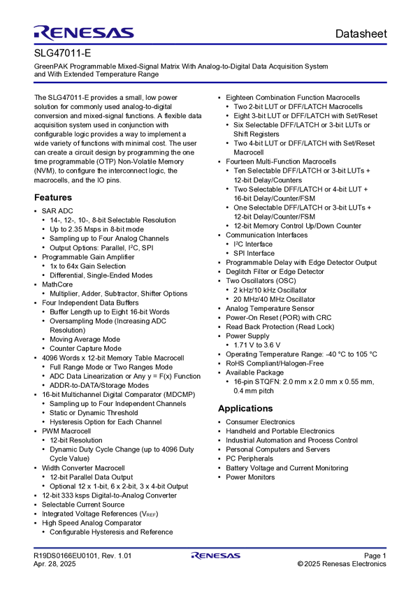 AnalogPAK Programmable Mixed-Signal IC with Extended Temperature Range, VDD Range: 1.71-3.6V, 14 GPIOs, 1 ACMPs, I2C, ADC (14-bit, SAR), PGA, DAC (12-bit), MathCore, SPI