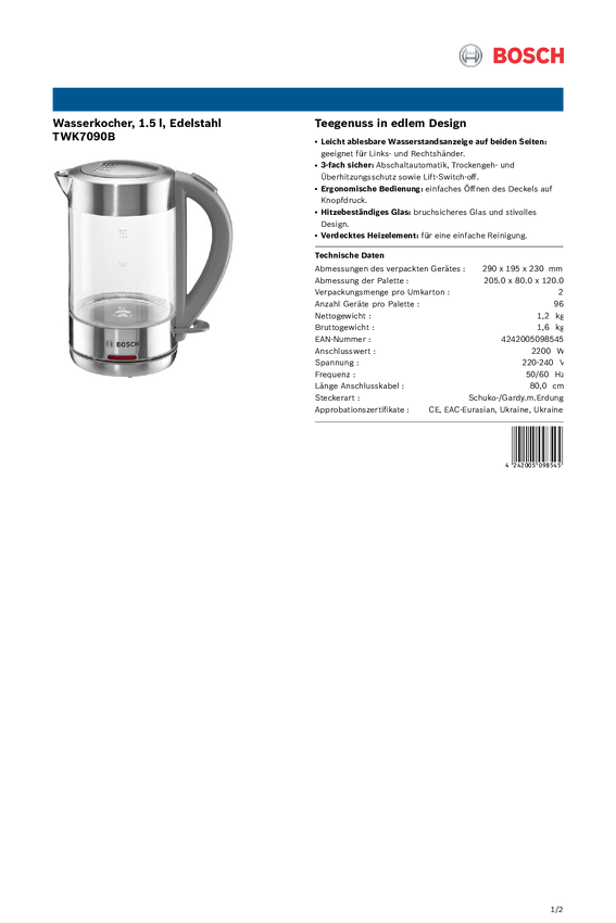 Bosch Haushalt TWK7090B Czajnik stali szlachetnej, przeźroczysty, szary (matowy) Pojemność: 1.5 l
