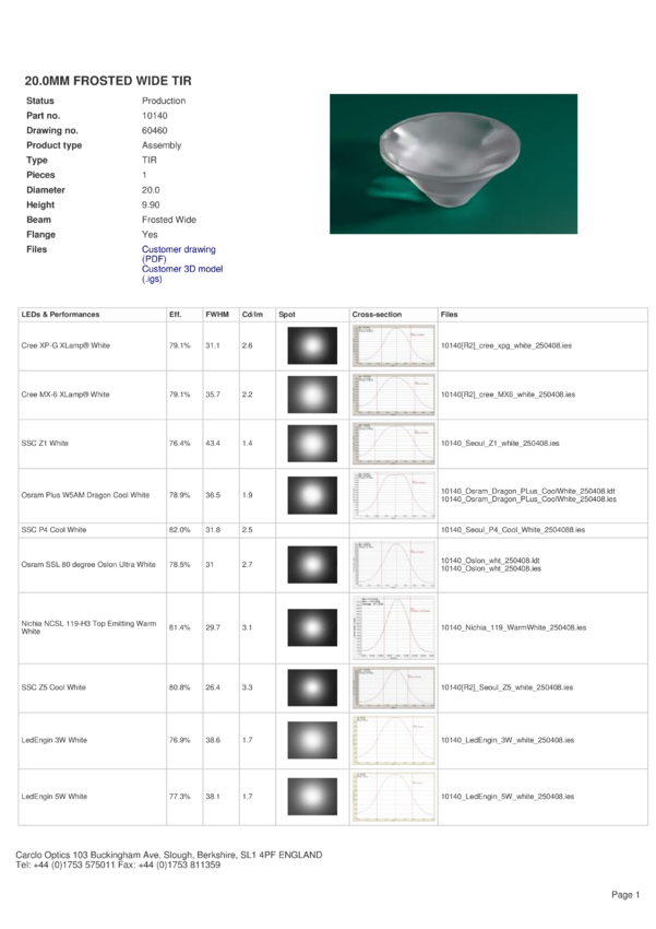 Soczewka Carclo 10140, matowa, szeroka, optyka typu TIR, do diod Cree serii XP-G, XP-C, XT-E, XB-D, XM-L, MX6, śr: 20mm, wys:9,9mm, FWHM(XP-G):31,1° FWHM(XP-C):24,6&deg