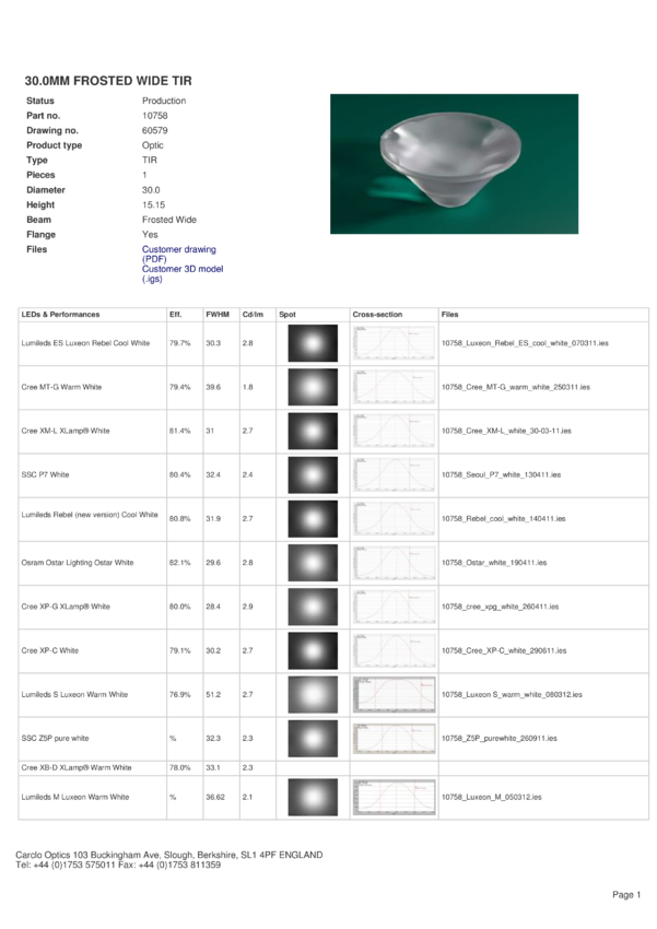 Soczewka Carclo 10758, matowa, szeroka, optyka typu TIR, do diod Cree serii: XP, MT-G, MT-G2, XM-L, XT-E, XB-D, śr:30mm, wys:15,15mm, FWHM(XP-E):29,3° FWHM(XP-G):28,4° FWHM(XP-C):30,2°