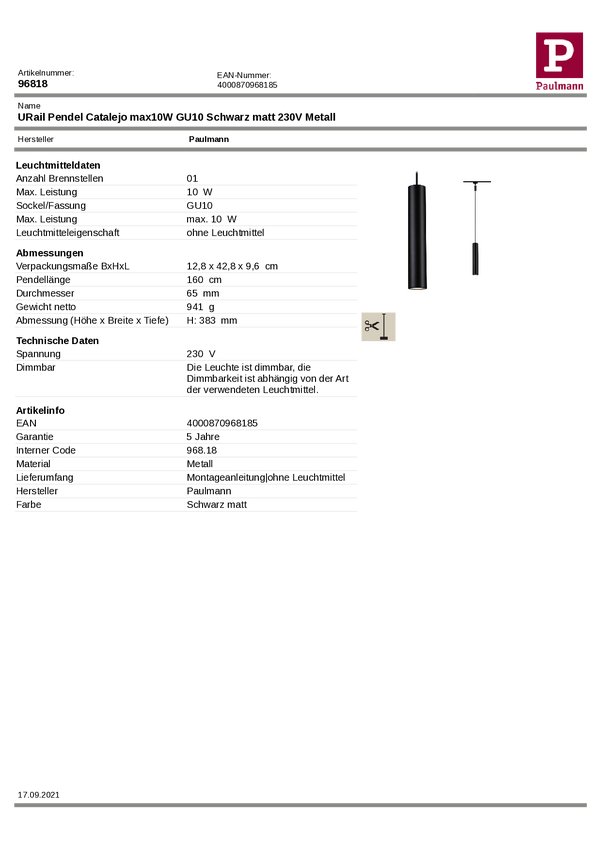 Lampa do systemu szynowego, wysokonapięciowego Paulmann URail Pendel Catalejo 96818 GU10 czarny (matowy)