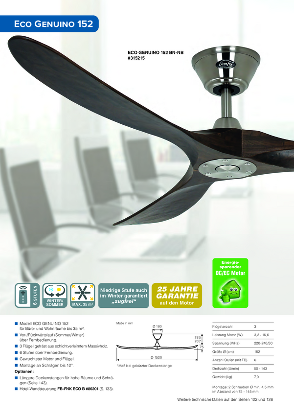 CasaFan ECO GENUINO 152 MS-NB Wentylator sufitowy 16.6 W (Ø x W) 1520 mm x 285 mm czarny (matowy) pilot zdalnego sterowa