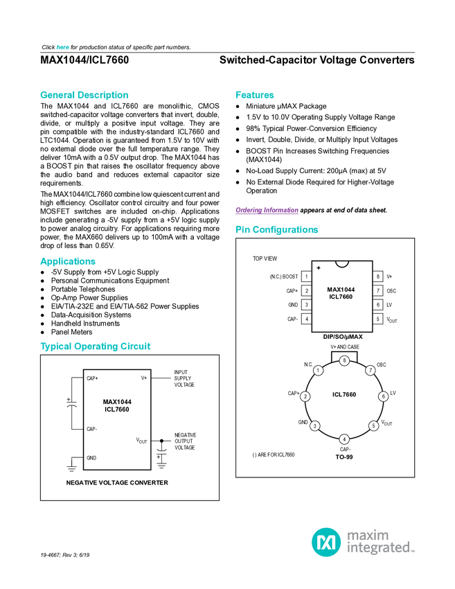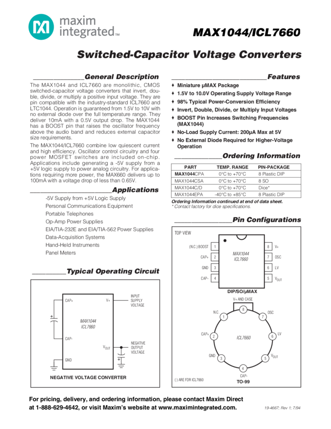 ICL7660, MAX1044 Switched-Capacitor Voltage Converters