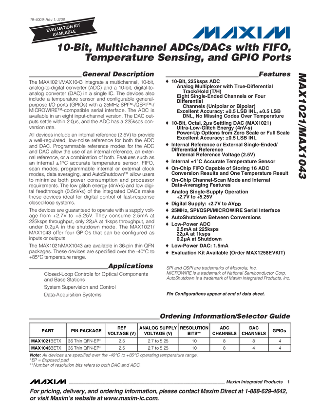10-Bit, Multichannel ADCs/DACs with FIFO, Temperature Sensing, and GPIO Ports