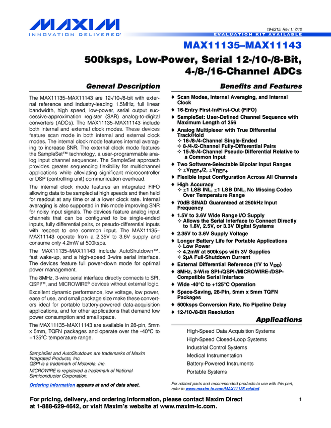 MAX11135, MAX11136, MAX11137, MAX11138, MAX11139, MAX11140, MAX11141, MAX11142, MAX11143 500ksps, Low-Power, Serial 12-/10-/8-Bit, 4-/8-/16-Channel ADCs