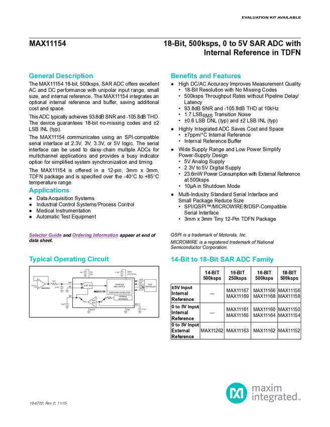 MAX11154 18-Bit, 500ksps, 0 to 5V SAR ADC with Internal Reference in TDFN