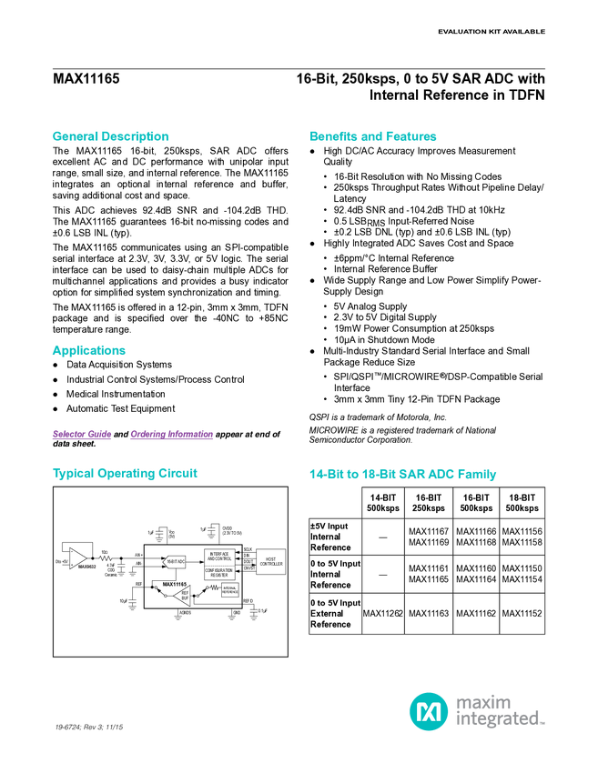 MAX11165 16-Bit, 250ksps, 0 to 5V SAR ADC with Internal Reference in TDFN