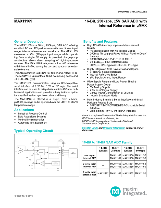MAX11169 16-Bit 250ksps SAR ADC Pseudo-Differential Bipolar Input with Internal Reference in uMAX-10