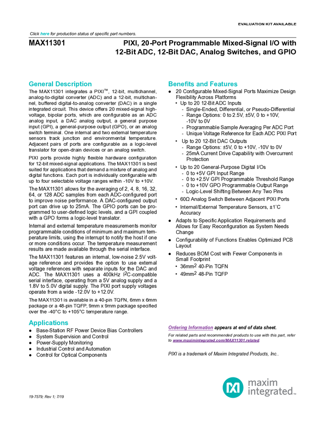 MAX11301 PIXI, 20-Port Programmable Mixed-Signal I/O with 12-Bit ADC, 12-Bit DAC, Analog Switches, and GPIO