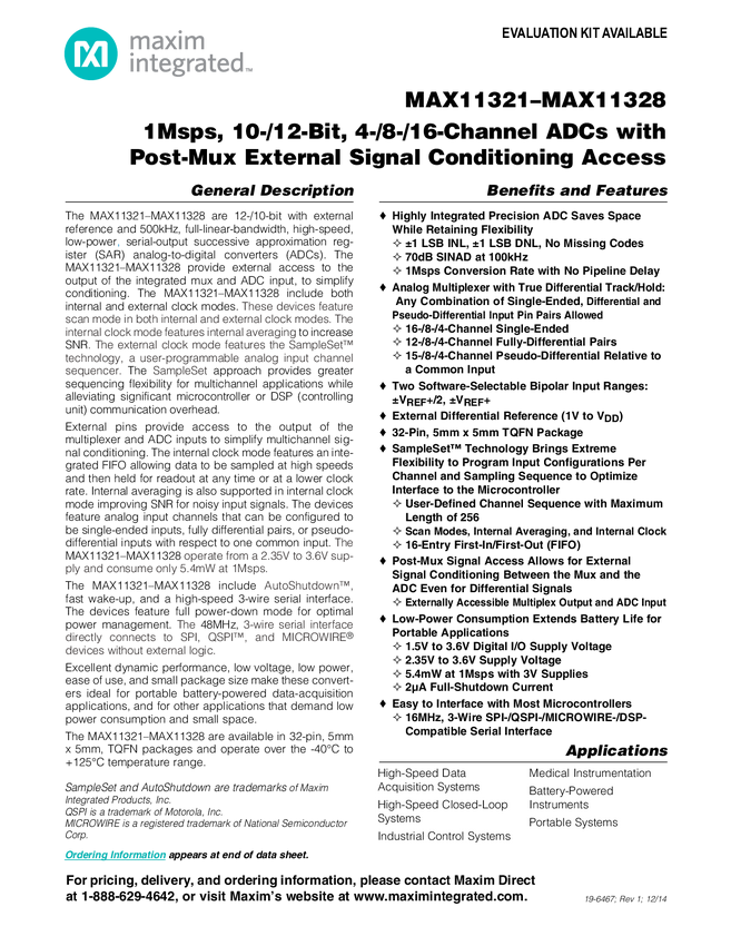 MAX11321, MAX11322, MAX11324, MAX11325, MAX11327, MAX11328 1Msps, 10-/12-Bit, 4-/8-/16-Channel ADCs with Post-Mux External Signal Conditioning Access