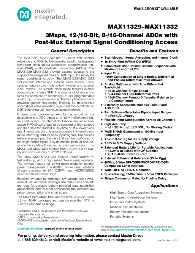 MAX11329, MAX11330, MAX11331, MAX11332 3Msps, 12-/10-Bit, 8-/16-Channel ADCs with Post-Mux External Signal Conditioning Access