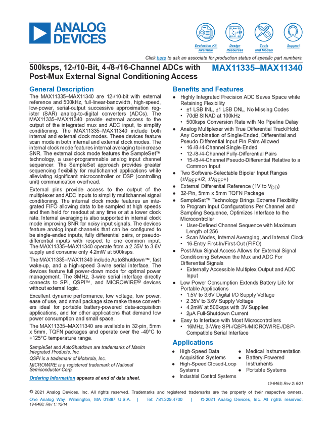 MAX11335, MAX11336, MAX11337, MAX11338, MAX11339, MAX11340 500ksps, 12-/10-Bit, 4-/8-/16-Channel ADCs with Post-Mux External Signal Conditioning Access
