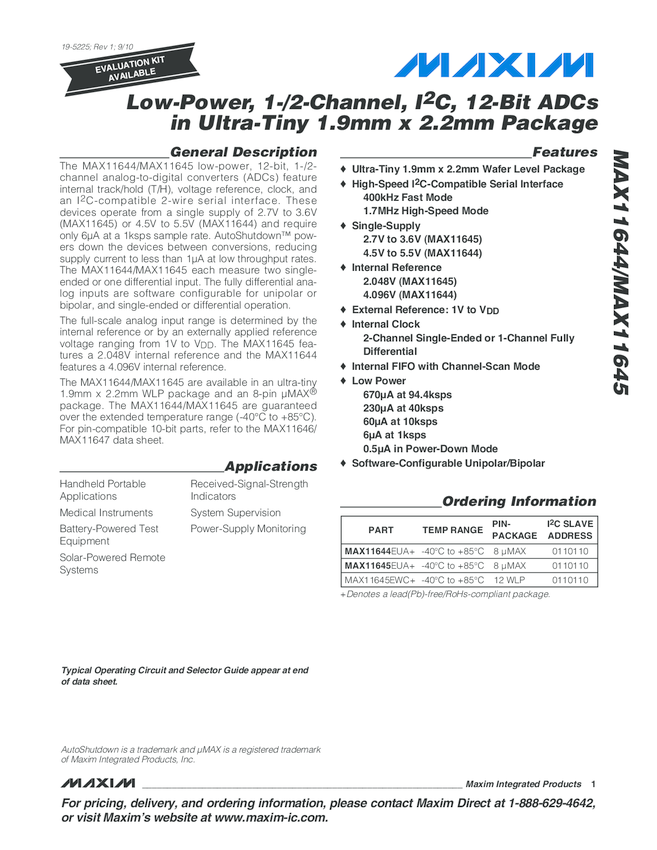 MAX11645 Low-Power, 2 Channel, 2-Wire Serial, 12-bit ADCs
