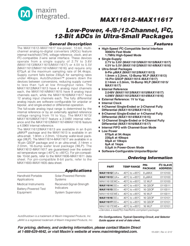 MAX11612, MAX11613, MAX11614, MAX11615, MAX11616, MAX11617 Low-Power, 4-/8-/12-Channel, I²C, 12-Bit ADCs in Ultra-Small Packages
