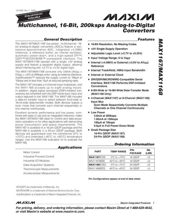 MAX1167, MAX1168 Multichannel, 16-Bit, 200ksps Analog-to-Digital Converters