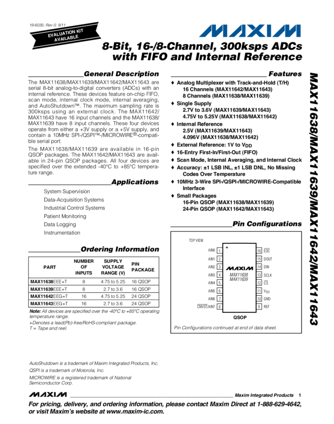 MAX11638, MAX11639, MAX11642, MAX11643 8-Bit, 16-/8-Channel, 300ksps ADCs with FIFO and Internal Reference