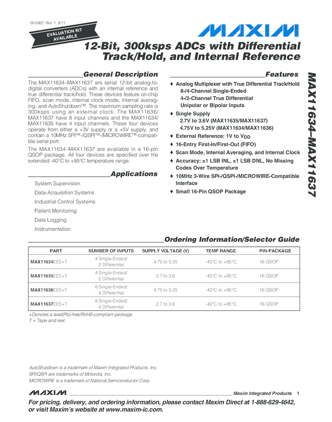 MAX11637 12-bit 300ksps ADCs with Differential Track/Hold, FIFO, and Internal Reference