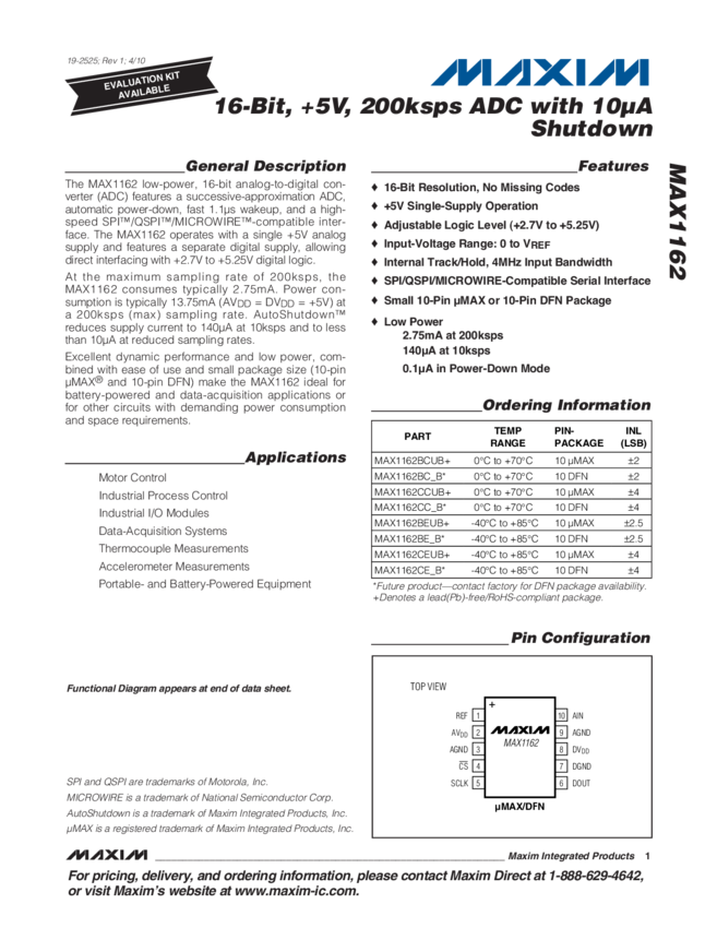 MAX1162 16-bit, +5V, 200ksps ADC with 10&#181A Shutdown