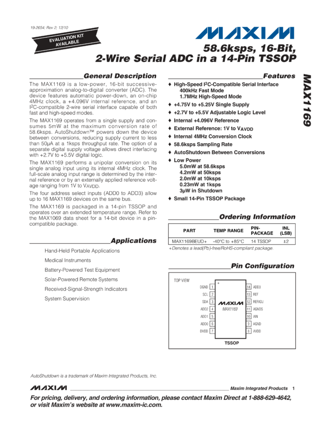 MAX1169 58.6ksps, 16-Bit, 2-Wire Serial ADC in a 14-Pin TSSOP